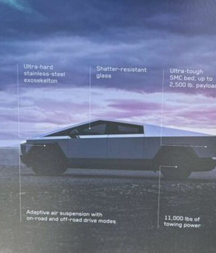 Other marketing materials near the truck mention its “ultra-tough” composite bed, its shatterproof glass, and its “exoskeleton.” We’ve seen Joe Rogan shoot the truck with a compound bow, and the automaker showed off a truck that it claimed had been shot with a Tommy gun, though it’s unclear why we’re testing automotive sheet metal with a 1930s bank robber’s weapon.